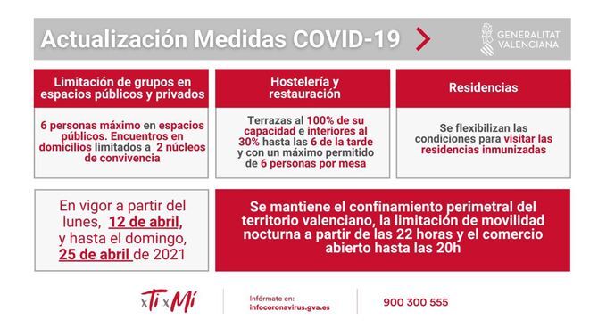 El president ha señalado que, desde la perspectiva de "prudencia máxima" y de consolidación de la estabilidad sanitaria, se ha acordado prorrogar el resto de medidas en vigor durante otros 15 días, entre ellas el cierre perimetral de la Comunitat y la limitación de la movilidad nocturna entre las 22.00 y las 6.00 horas.