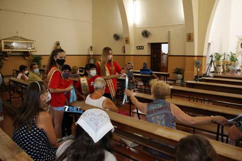 Pero antes, vecinos y visitantes se han reunido a las puertas de la parroquia de San Jaime para recibir las cintas conmemorativas del 57º aniversario de la Virgen de la Paciencia, que han sido bendecidas tras pasar por el manto de la imagen. Un acto al que no ha faltado la alcaldesa, Araceli de Moya, así como la concejala del área, Jennifer Casañ, y la reina de las fiestas, Sheila Museros, quien ha estado acompañada por sus damas y festeros.