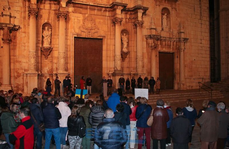 La ciudadanía de Alcalà de Xivert ha querido mostrar su apoyo al pueblo ucraniano ante la sinrazón del ataque que está sufriendo sumándose a la concentración convocada por el ayuntamiento de la localidad celebrada este miércoles en la plaza de la iglesia. Numerosos vecinos se han sumado al acto, celebrado alrededor de una bandera de Ucrania de 6 metros, en el que han intervenido el alcalde de la localidad, Francisco Juan Mars, y dos ciudadanos ucranianos, Andres Morejon y Andrei Parashchuk. En las escaleras de la iglesia también se encendieron velas en recuerdo de las víctimas de la guerra.