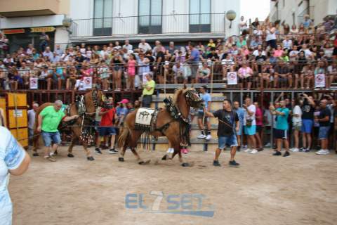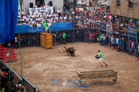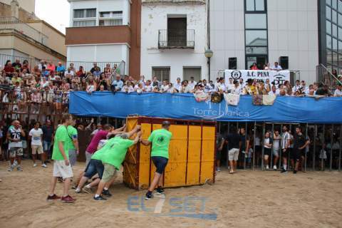 Torreblanca entraba de lleno en su programación taurina este viernes 26 de agosto con la celebración de la primera jornada completa de entrada, prueba y exhibiciones taurinas. Como acto destacado de este día marcadamente taurino, la Peña Taurina Torreblanca ha tenido especial protagonismo con la desencajonada de un toro cerril de la prestigiosa ganadería de Rocío de la Cámara, de Jerez de la Frontera, de nombre Flotador, guarismo 8 y número 45, que tras su prueba sería embolado por la noche.