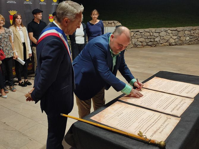 La ceremonia ha incluido la presentación a todos los vecinos de Moró de la señalética que a partir de ahora informará a todos los visitantes de la localidad que está hermanada con el pueblo francés de Nay, en los accesos a la población. Asimismo, se han firmado las cartas de hermanamiento por parte de los dos alcaldes, un total de tres, una por cada idioma oficial de las dos poblaciones: francés, castellano y valenciano.
