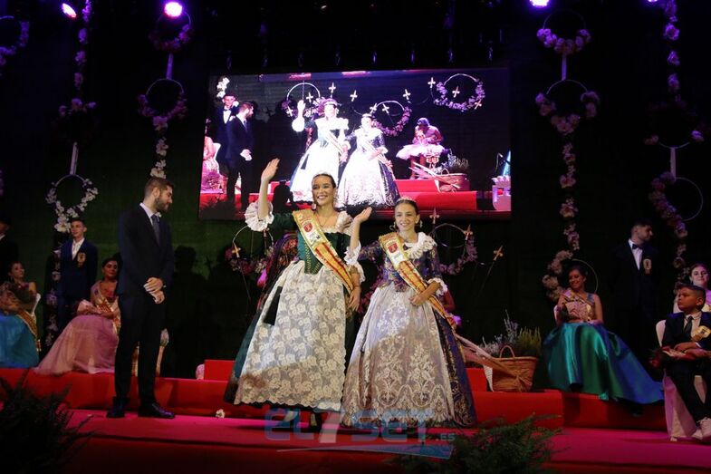 La joven Mireia Aparici y la pequeña Elena Gimeno, reinas mayor e infantil 2022, desfilaron por el pasillo central, arropadas por los aplausos de un público entregado. Ambas subieron hasta lo alto del escenario para convertirse, oficialmente, en las nuevas reinas mayor e infantil, respectivamente, de manos de sus antecesoras, Victoria Gómez y Sheila Museros, quienes no pudieron evitar alguna que otra lágrima en esta agridulce despedida.