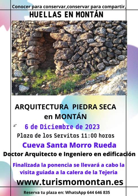 Miércoles 6 de diciembre: Jornada de la piedra seca ‘Huellas en Montán’, sobre la arquitectura de piedra seca en el municipio. La ofrecerá en la Plaza de los Servitas, a las 11 horas, la doctora arquitecta e ingeniera en Edificación Cueva Santa Morro Rueda. Terminada la ponencia se llevará a cabo la visita guiada a la Calera la Tejería.