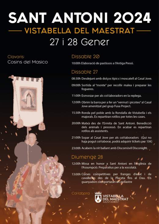 El domingo 28, la misa en honor a Sant Antoni se celebrará a las 12h en la iglesia de la Asunción. A las 13h, se llevarán a cabo carreras competitivas por edades y de caballerías desde la Placeta hasta el Dau. Cabe destacar que, simultáneamente a las carreras, los clavarios ofrecerán chocolate para todos los asistentes.