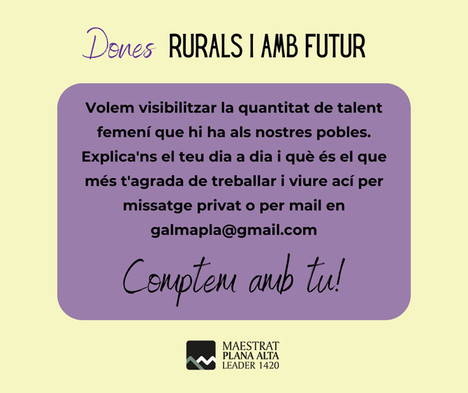 El Grupo de Acción Local Maestrat Plana Alta ha puesto en marcha por segundo año consecutivo la campaña "Dones Rurals i Amb Futur" para destacar el papel de las mujeres en el territorio rural. La iniciativa, lanzada en coincidencia con la conmemoración del Día Internacional de la Mujer el próximo 8 de marzo, busca recopilar imágenes de mujeres que trabajan en los 24 municipios que conforman esta agrupación. Estas imágenes se utilizarán para crear un álbum conmemorativo que se publicará en honor a las mujeres rurales el día internacional.
