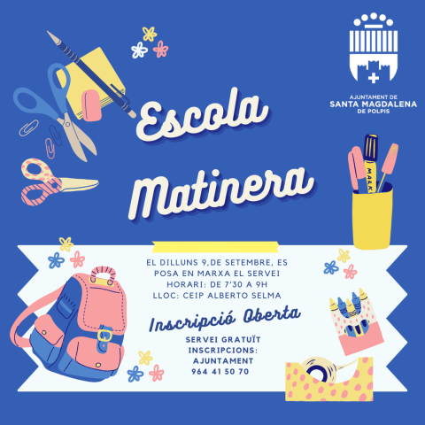 Todo el personal del CEIP Alberto Selma está ultimando los detalles para asegurar un inicio de curso sin contratiempos. El próximo lunes también comenzará el servicio de comedor escolar y las ‘matineras’, que estarán disponibles en horario de 7.30 a 9h. Se recuerda a las familias que desean utilizar el servicio de comedor que deben comunicarlo ya al centro. Para inscribir a sus hijos e hijas en las ‘matineras’, deben dirigirse al Ayuntamiento de Santa Magdalena o llamar al 964 415070.