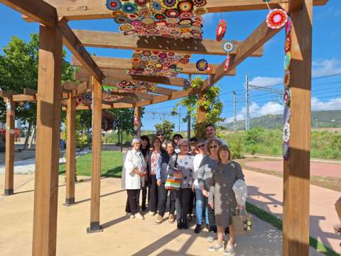 El colectivo de mujeres ha decorado una pérgola del parque con 800 flores tejidas a mano, en una intervención artística que celebra el Día de las Flores