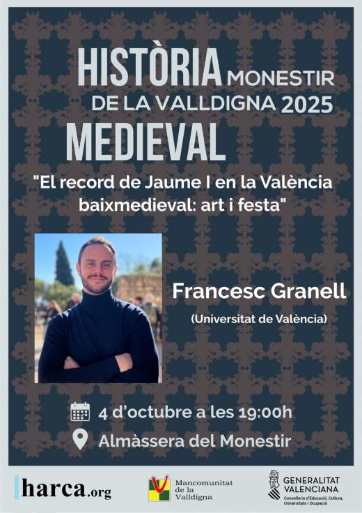 El Monasterio de Santa María de Valldigna, en Simat, acogerá una nueva cita del ciclo de Divulgación Histórica Medieval de la Corona de Aragón organizado por el Grup Harca y la Mancomunitat de la Valldigna con el apoyo de la Generalitat Valenciana, con la conferencia “El record de Jaume I en la València baixmedieval: art i festa”, impartida por el experto medievalista Francesc Granell. En concreto, la charla pretende profundizar en una cuestión a menudo olvidada: cómo se construía y se transmitía la memoria del Rey Conquistador a través de las imágenes y de las celebraciones colectivas, más allá de las páginas de las crónicas y los textos literarios.