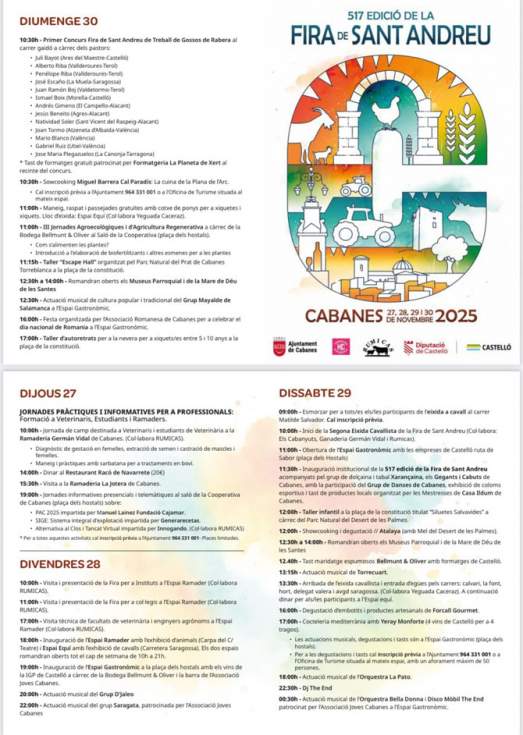 La 517 edición de la Fira de Sant Andreu inicia hoy su programación con una marcada orientación hacia la formación de profesionales y la divulgación del sector agrario. Consolidada como uno de los eventos agrícolas y ganaderos más relevantes de la provincia de Castellón, la feria refuerza este año pilares fundamentales como las jornadas profesionales, la promoción de productos gastronómicos locales —a través de Castelló Ruta de Sabor y los vinos IGP Castelló—, y la incorporación de destacadas novedades como el primer concurso de perros pastores y la creación de un espacio específico para el sector equino.
