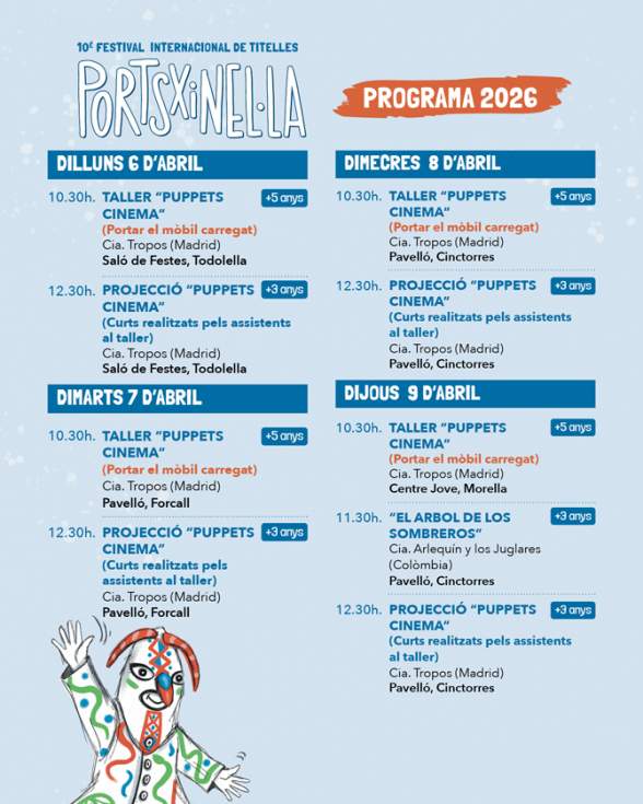 Jueves 9 de abril: Centro Joven, Morella: Taller ‘Puppets cinema’, por Cia. Tropos (Madrid). 10:30. Mayores de 5 años. Llevar el móvil cargado.