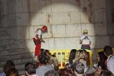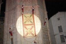 En la parte final de la ceremonia y ante la mirada atónita de los cientos de personas que abarrotaban la plaza de la iglesia, un grupo de jóvenes xivertenses se descolgó por la parte exterior de la torre para poner en práctica un espectacular montaje.